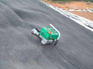 土工膜鋪設(shè)完成后,應(yīng)盡量減少在膜面上行走、搬動(dòng)工具等,凡能對(duì)膜造成危害的物件,均不應(yīng)放在膜上或攜帶在膜上行走,以免對(duì)膜造成意外損傷。工膜的焊接熱鍥焊機(jī)焊接工序分為調(diào)節(jié)壓力 設(shè)定溫度 設(shè)定速度 焊縫搭接檢查 裝膜入機(jī) 啟動(dòng)馬達(dá)加壓焊接。接縫處不得有油污、灰塵,土工膜的搭接段面不應(yīng)夾有泥沙等雜物,當(dāng)有雜物時(shí)必須在焊接前清理干凈。每天焊接開始時(shí),必須在現(xiàn)場(chǎng)先試焊一 條0.9mm×0.3mm的試樣,搭接寬度不小于10cm,并用拉力機(jī)現(xiàn)場(chǎng)進(jìn)行剝離和剪切試驗(yàn),試樣合格后,便可用當(dāng)時(shí)調(diào)整好的速度、壓力、溫度進(jìn)行正是 焊接。試樣上需標(biāo)明日期、時(shí)刻、環(huán)境溫度。熱鍥焊機(jī)在焊接過(guò)程中,需隨時(shí)注意焊機(jī)的運(yùn)行情況,要根據(jù)現(xiàn)場(chǎng)的實(shí)際情況對(duì)速度和溫度進(jìn)行微調(diào)。焊縫要求整齊、 美觀、不得有滑焊、跳走現(xiàn)象。